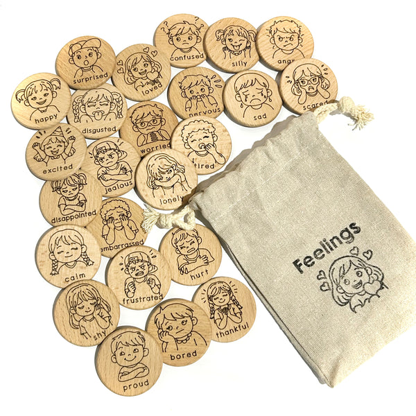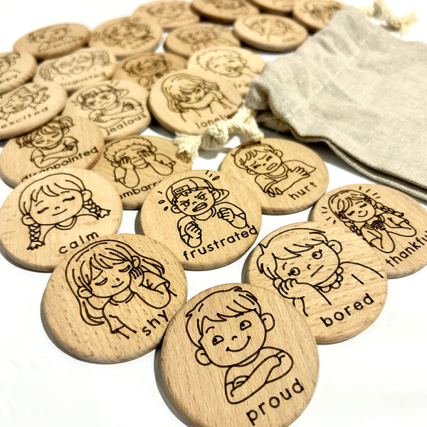 • 24 different feelings permanently laser engraved onto one side of the wooden disc. Each disc features a child illustration expressing a unique feeling along with the emotion word for early reading and vocabulary support.
